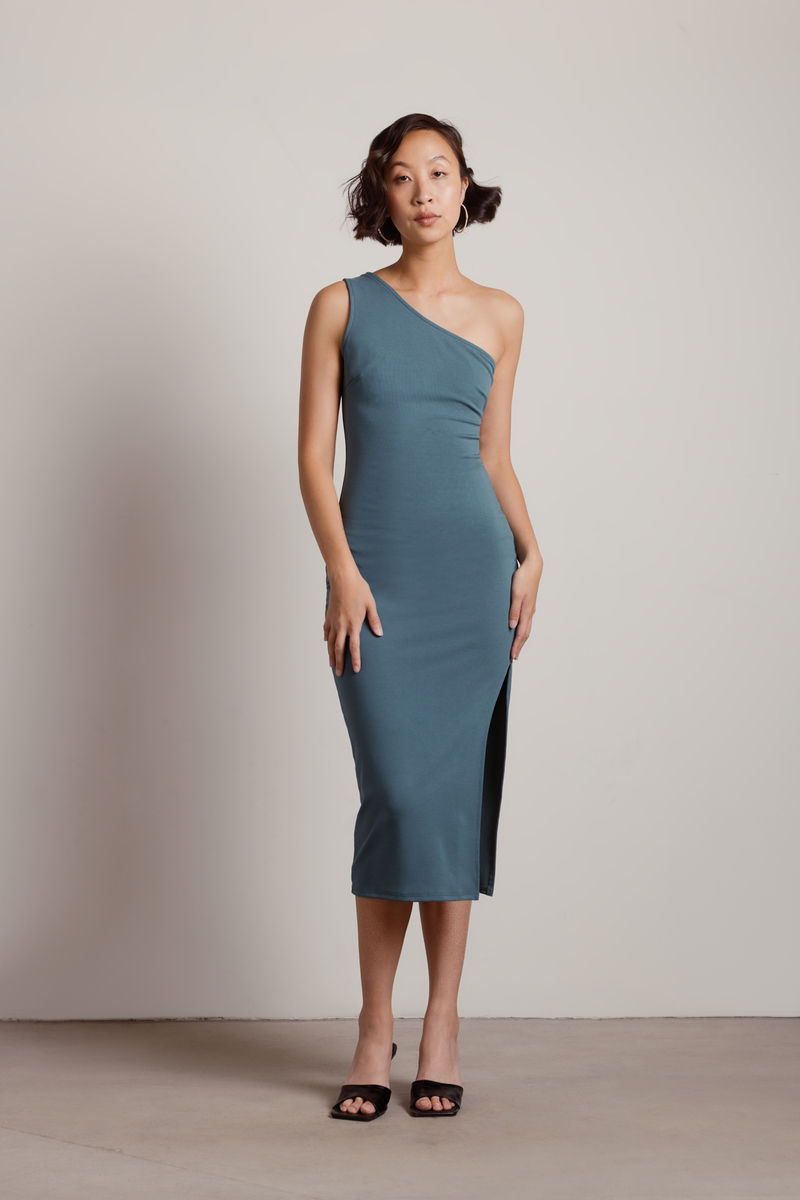 Steal the spotlight in the Riviera Balsam Green One Shoulder High Slit Bodycon Midi Dress in Balsam Green! Featuring a stunning one-shoulder design and high slit, this form-fitting dress is perfect for Christmas parties, New Year’s Eve, or weddings. Complete the look with gold jewelry and high heels for ultimate chic vibes.